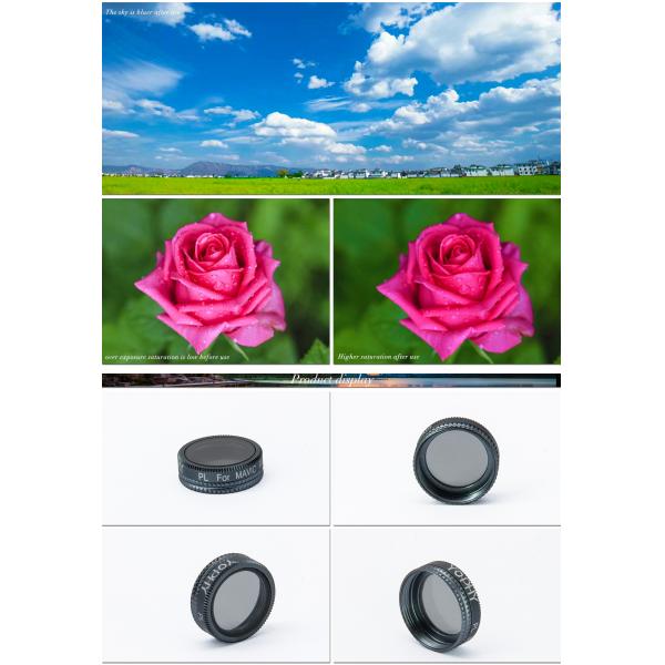 | DJI Mavic Air PL 3in1 | ND4,ND8,ND16,ND32,ND64,ND4/PL, ND8/PL,ND16/PL,ND32/PL,ND64/PL | Aviation aluminum alloy+AGC glass | 58g | Thread interface; Golden/grey/black; |
